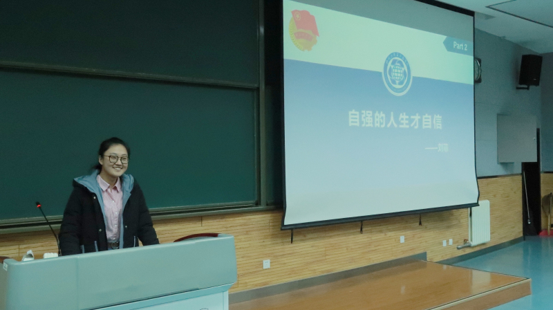 2018级刘菲同学“以自强的人生才自信”为题,分别从“初心——见贤思齐”讲述学习路上遇到的挫折,到“奋斗——踏实学习”讲述两年来所获得的学习成绩和积极参与各项工作的情况,最后“前行——负重奔跑”表达作为新一代的青年和教师应该拥有的责任和担当,并对未来怀抱美好希望。“我把主观能动性分为信心、决心、细心和恒心,信心是知难而上,相信自己的能力……”刘菲同学逐一向同学们阐述自己在学习上的技巧与方法,并引用“宝剑锋自磨砺出,梅花香自苦寒来”的诗句鼓励大家发愤图强。