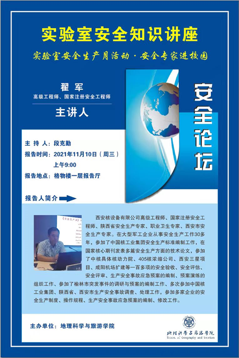 作为2021年实验室安全生产月重要活动内容之一:安全专家进校园,实验中心邀请到了我市安全应急管理专家、国家注册安全工程师翟军老师,针对新葡的京官网各类实验室存在的安全隐患进行一次专项讲座,欢迎广大师生前来参会。
